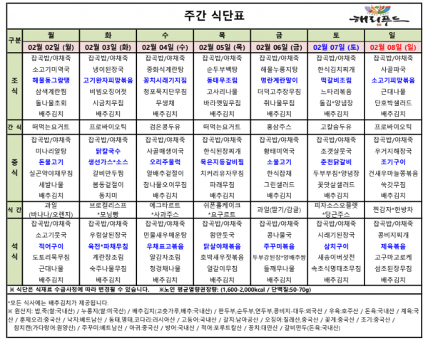 2월 첫째주 식단표 페이지 정보 작성자 은천노인복지회 작성일26-02-04 11:48 조회299회 댓글0건 관련링크 이전글 다음글 목록 답변 본문 2월 첫째주 어르신 식단표 안내해 드립니다. 정성과 영양을 담아 준비하겠습니다. 이전글 다음글 목록 답변