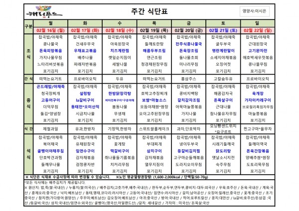 2월 셋째주 식단표 페이지 정보 작성자 은천노인복지회 작성일26-02-12 17:43 조회3,650회 댓글0건 관련링크 이전글 다음글 목록 답변 본문 2월 셋째주 어르신 식단표 안내해 드립니다. 정성과 영양을 담아 준비하겠습니다. 이전글 다음글 목록 답변