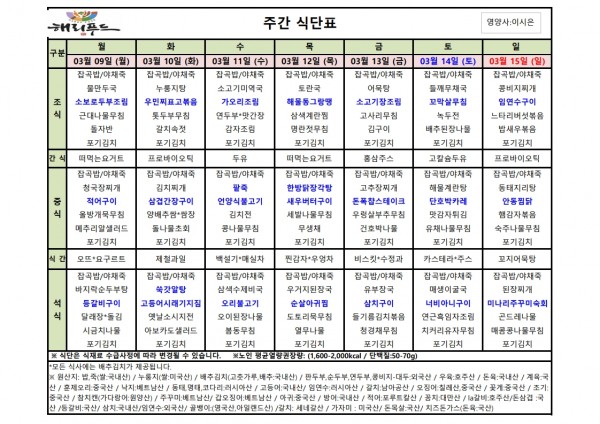 3월 둘째주 식단표 페이지 정보 작성자 은천노인복지회 작성일26-03-06 15:04 조회2,199회 댓글0건 관련링크 이전글 다음글 목록 답변 본문 3월 둘째주 어르신 식단표 안내해 드립니다. 정성과 영양을 담아 준비하겠습니다. 이전글 다음글 목록 답변