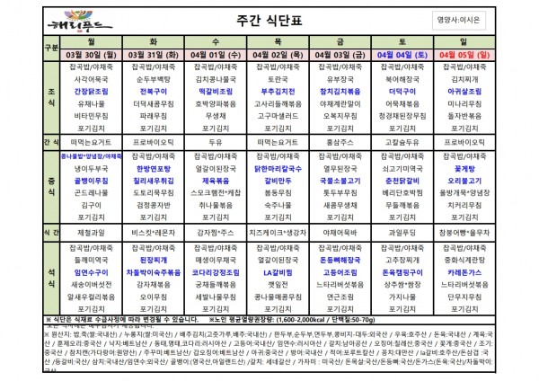 3월 다섯째주 식단표 페이지 정보 작성자 은천노인복지회 작성일26-03-26 17:49 조회595회 댓글0건 관련링크 이전글 다음글 목록 답변 본문 3월 다섯째주 어르신 식단표 안내해 드립니다. 정성과 영양을 담아 준비하겠습니다. 이전글 다음글 목록 답변